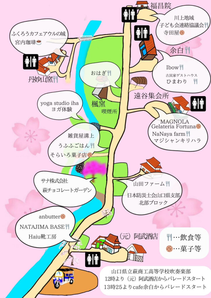遠谷集会場、丹妙山窯(食事処)、余白(カフェ)、福昌院(お寺)、元阿武酒店のトイレをご利用頂けます。(地図参照)